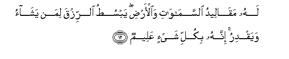 12. Lahu maqaleedu alssamawati waal-ardi yabsutu alrrizqa liman yashao wayaqdiru innahu bikulli shay-in AAaleemun