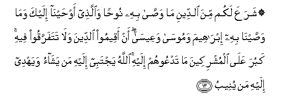 13. SharaAAa lakum mina alddeeni ma wassa bihi noohan waallathee awhayna ilayka wama wassayna bihi ibraheema wamoosa waAAeesa an aqeemoo alddeena wala tatafarraqoo feehi kabura AAala almushrikeena ma tadAAoohum ilayhi Allahu yajtabee ilayhi man yashao wayahdee ilayhi man yuneebu