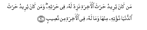 20. Man kana yureedu hartha al-akhirati nazid lahu fee harthihi waman kana yureedu hartha alddunya nu/tihi minha wama lahu fee al-akhirati min naseebin