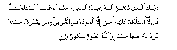 23. Thalika allathee yubashshiru Allahu AAibadahu allatheena amanoo waAAamiloo alssalihati qul la as-alukum AAalayhi ajran illa almawaddata fee alqurba waman yaqtarif hasanatan nazid lahu feeha husnan inna Allaha ghafoorun shakoorun