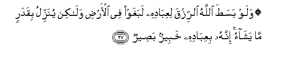 27. Walaw basata Allahu alrrizqa liAAibadihi labaghaw fee al-ardi walakin yunazzilu biqadarin ma yashao innahu biAAibadihi khabeerun baseerun