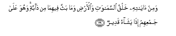 29. Wamin ayatihi khalqu alssamawati waal-ardi wama baththa feehima min dabbatin wahuwa AAala jamAAihim itha yashao qadeerun
