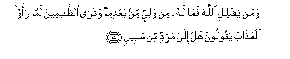 44. Waman yudlili Allahu fama lahu min waliyyin min baAAdihi watara alththalimeena lamma raawoo alAAathaba yaqooloona hal ila maraddin min sabeelin