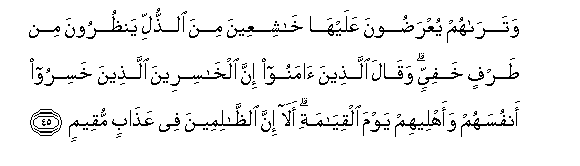 45. Watarahum yuAAradoona AAalayha khashiAAeena mina alththulli yanthuroona min tarfin khafiyyin waqala allatheena amanoo inna alkhasireena allatheena khasiroo anfusahum waahleehim yawma alqiyamati ala inna alththalimeena fee AAathabin muqeemin