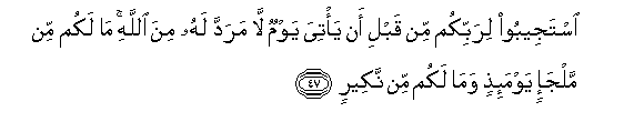 47. Istajeeboo lirabbikum min qabli an ya/tiya yawmun la maradda lahu mina Allahi ma lakum min malja-in yawma-ithin wama lakum min nakeerin