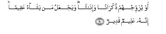 50. Aw yuzawwijuhum thukranan wa-inathan wayajAAalu man yashao AAaqeeman innahu AAaleemun qadeerun
