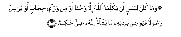 51. Wama kana libasharin an yukallimahu Allahu illa wahyan aw min wara-i hijabin aw yursila rasoolan fayoohiya bi-ithnihi ma yashao innahu AAaliyyun hakeemun