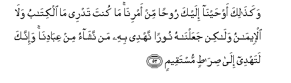 52. Wakathalika awhayna ilayka roohan min amrina ma kunta tadree ma alkitabu wala al-eemanu walakin jaAAalnahu nooran nahdee bihi man nashao min AAibadina wa-innaka latahdee ila siratin mustaqeemin