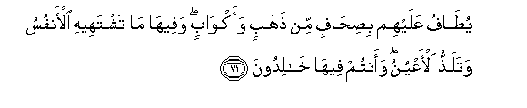 71. Yutafu AAalayhim bisihafin min thahabin waakwabin wafeeha ma tashtaheehi al-anfusu watalaththu al-aAAyunu waantum feeha khalidoona