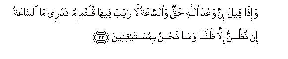 32. Wa-itha qeela inna waAAda Allahi haqqun waalssaAAatu la rayba feeha qultum ma nadree ma alssaAAatu in nathunnu illa thannan wama nahnu bimustayqineena