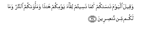 34. Waqeela alyawma nansakum kama naseetum liqaa yawmikum hatha wama/wakumu alnnaru wama lakum min nasireena