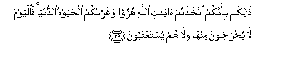 35. Thalikum bi-annakumu ittakhathtum ayati Allahi huzuwan wagharratkumu alhayatu alddunya faalyawma la yukhrajoona minha wala hum yustaAAtaboona