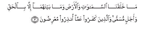 3. Ma khalaqna alssamawati waal-arda wama baynahuma illa bialhaqqi waajalin musamman waallatheena kafaroo AAamma onthiroo muAAridoona