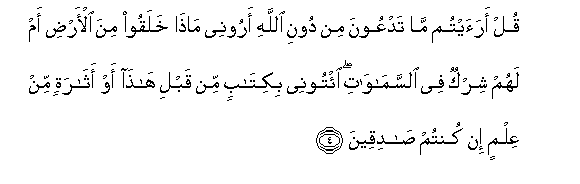 4. Qul araaytum ma tadAAoona min dooni Allahi aroonee matha khalaqoo mina al-ardi am lahum shirkun fee alssamawati eetoonee bikitabin min qabli hatha aw atharatin min AAilmin in kuntum sadiqeena