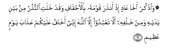 21. Waothkur akha AAadin ith anthara qawmahu bial-ahqafi waqad khalati alnnuthuru min bayni yadayhi wamin khalfihi alla taAAbudoo illa Allaha innee akhafu AAalaykum AAathaba yawmin AAatheemin