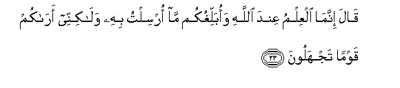 23. Qala innama alAAilmu AAinda Allahi waoballighukum ma orsiltu bihi walakinnee arakum qawman tajhaloona