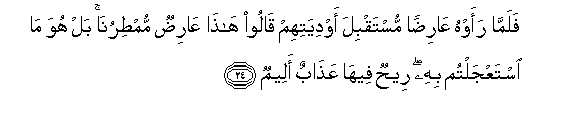24. Falamma raawhu AAaridan mustaqbila awdiyatihim qaloo hatha AAaridun mumtiruna bal huwa ma istaAAjaltum bihi reehun feeha AAathabun aleemun