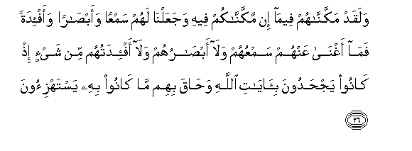 26. Walaqad makkannahum feema in makkannakum feehi wajaAAalna lahum samAAan waabsaran waaf-idatan fama aghna AAanhum samAAuhum wala absaruhum wala af-idatuhum min shay-in ith kanoo yajhadoona bi-ayati Allahi wahaqa bihim ma kanoo bihi yastahzi-oona