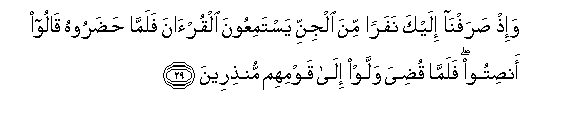 29. Wa-ith sarafna ilayka nafaran mina aljinni yastamiAAoona alqur-ana falamma hadaroohu qaloo ansitoo falamma qudiya wallaw ila qawmihim munthireena
