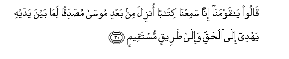 30. Qaloo ya qawmana inna samiAAna kitaban onzila min baAAdi moosa musaddiqan lima bayna yadayhi yahdee ila alhaqqi wa-ila tareeqin mustaqeemin