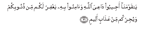 31. Ya qawmana ajeeboo daAAiya Allahi waaminoo bihi yaghfir lakum min thunoobikum wayujirkum min AAathabin aleemin