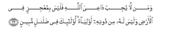 32. Waman la yujib daAAiya Allahi falaysa bimuAAjizin fee al-ardi walaysa lahu min doonihi awliyaa ola-ika fee dalalin mubeenin