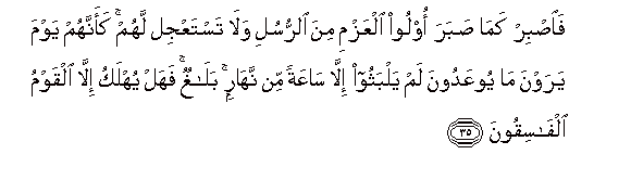 35. Faisbir kama sabara oloo alAAazmi mina alrrusuli wala tastaAAjil lahum kaannahum yawma yarawna ma yooAAadoona lam yalbathoo illa saAAatan min naharin balaghun fahal yuhlaku illa alqawmu alfasiqoona