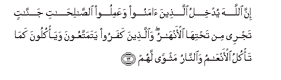 12. Inna Allaha yudkhilu allatheena amanoo waAAamiloo alssalihati jannatin tajree min tahtiha al-anharu waallatheena kafaroo yatamattaAAoona waya/kuloona kama ta/kulu al-anAAamu waalnnaru mathwan lahum
