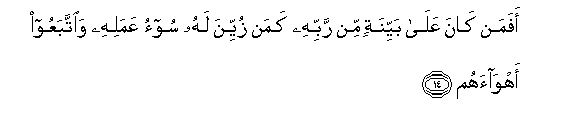14. Afaman kana AAala bayyinatin min rabbihi kaman zuyyina lahu soo-o AAamalihi waittabaAAoo ahwaahum