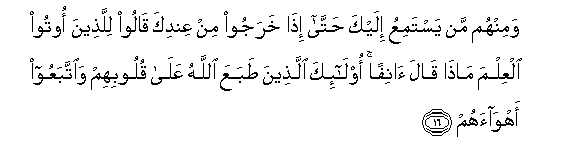 16. Waminhum man yastamiAAu ilayka hatta itha kharajoo min AAindika qaloo lillatheena ootoo alAAilma matha qala anifan ola-ika allatheena tabaAAa Allahu AAala quloobihim waittabaAAoo ahwaahum