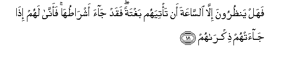 18. Fahal yanthuroona illa alssaAAata an ta/tiyahum baghtatan faqad jaa ashratuha faanna lahum itha jaat-hum thikrahum
