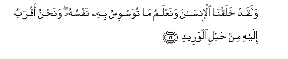 16. Walaqad khalaqna al-insana wanaAAlamu ma tuwaswisu bihi nafsuhu wanahnu aqrabu ilayhi min habli alwareedi