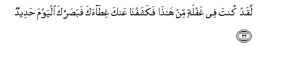 22. Laqad kunta fee ghaflatin min hatha fakashafna AAanka ghitaaka fabasaruka alyawma hadeedun
