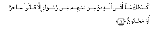 52. Kathalika ma ata allatheena min qablihim min rasoolin illa qaloo sahirun aw majnoonun