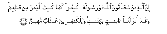 5. Inna allatheena yuhaddoona Allaha warasoolahu kubitoo kama kubita allatheena min qablihim waqad anzalna ayatin bayyinatin walilkafireena AAathabun muheenun