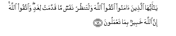 18. Ya ayyuha allatheena amanoo ittaqoo Allaha waltanthur nafsun ma qaddamat lighadin waittaqoo Allaha inna Allaha khabeerun bima taAAmaloona