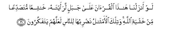 21. Law anzalna hatha alqur-ana AAala jabalin laraaytahu khashiAAan mutasaddiAAan min khashyati Allahi watilka al-amthalu nadribuha lilnnasi laAAallahum yatafakkaroona