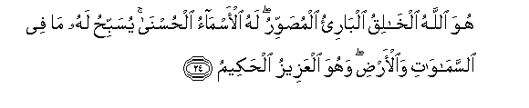 24. Huwa Allahu alkhaliqu albari-o almusawwiru lahu al-asmao alhusna yusabbihu lahu ma fee alssamawati waal-ardi wahuwa alAAazeezu alhakeemu