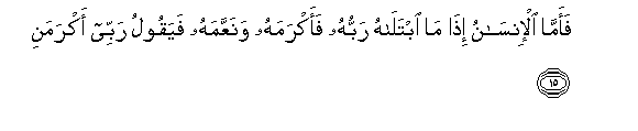 15. Faamma al-insanu itha ma ibtalahu rabbuhu faakramahu wanaAAAAamahu fayaqoolu rabbee akramani
