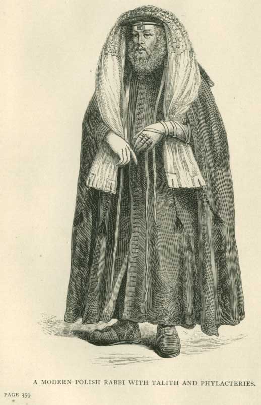 is 600, so that the sum total is 613, which represents the 613 precepts of the oral law. These rabbinic precepts correspond to the 613 Hebrew letters of which the decalogue is composed. They are divided into 248 positive precepts, which, the Rabbis say, equal the members of the human body; and into 365 negative precepts which, they also say, equal the number of the human veins. When the Talith is put on, the Jews pray, "That it may be made through my fulfilling this precept a spiritual garment for my soul, spirit, and breath, for my 248 spiritual members, and for my 365 spiritual veins." Orthodox Jews also daily wear a smaller Talith underneath their garments, and those who are more religious allow the fringes to be seen to remind them of the 613 precepts. The Scripture on which this observance is founded is Numb. xv. 37-39, "And the Lord spake unto Moses, saying, speak unto the children of Israel, and bid them that they make them fringes in the borders of their garments, throughout their generations, and that they put upon the fringe of the border a riband (or, as the Rabbis say, a thread) of blue: And it shall be unto you for a fringe, that ye may look upon it, and remember all the commandments of the Lord and do them." Our Lord, when on earth, wore the Tsitsith, for the diseased woman touched "the hem" (fringe κρασπέδον) of His garment (Matt. ix. 20), And he rebuked the Pharisees for their ostentation in enlarging the borders (fringes κράσπεδα) of their garments (Matt. xxiii. 5).