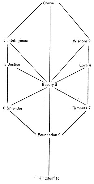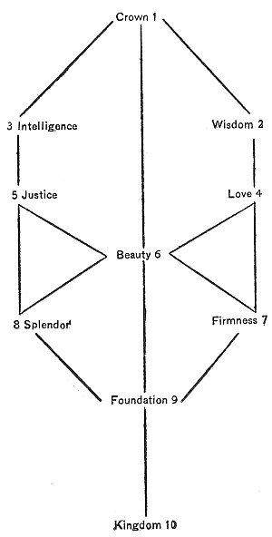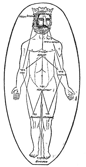 The Divine Man.--As to the Adam Kadmon which is shown in the following figure, the Crown represents the head; Wisdom, the brains; Intelligence which unites the two and produces the first triad, the heart or the understanding. The fourth and fifth Sephiroth, i.e., Love and Justice are the two arms, the former the right arm and the latter the left; one distributing life and the other death. The sixth Sephirah, Beauty, uniting these two opposites and producing the second triad, is the chest. Firmness and Splendor of the third triad represent the two legs, whereas Foundation, the ninth Sephirah, represents the genital organs, since it denotes the basis and source of all things. Finally Kingdom, the tenth Sephirah, represents the harmony of the whole Archetypal Man.
