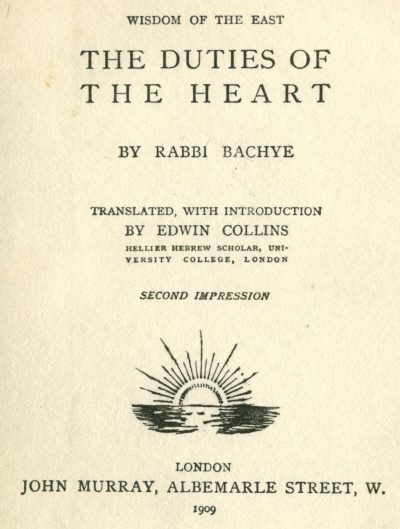 The Duties of the Heart, by Rabbi Bachye, tr. by Edwin Collins, [1909], at sacred-texts.com