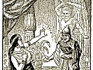 Pharaoh, however, had further adventures. The spirit was in merry mood and had a night's entertainment at the king's expense. No sooner did the king lie down upon his bed than the spirit tilted it and sent him sprawling on the floor. Whenever Pharaoh tried to lie down the same thing happened. He went from one room to another, but all efforts at rest were