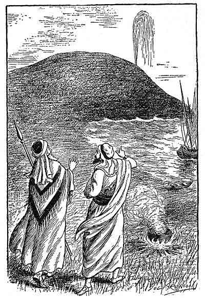 A shout from the boat caused them to look in that direction, and they saw their comrades pointing wildly and calling upon them to come back. Looking in the direction indicated, they saw the land rise up like a huge mountain and a tremendous stream of water gush forth.