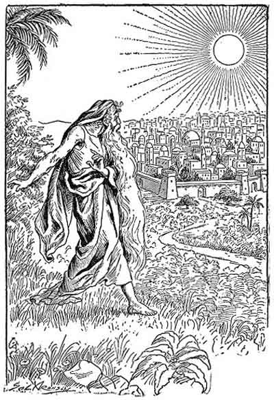 Onias passed sorrowfully on and at the top of the hill he stopped. Before him lay Jerusalem, not the once beautiful city with its hundreds of domes and minarets that caught the first rays of the sun each morning, but a vast heap of ruins and charred buildings. Onias threw himself on the ground and wept bitterly. No human being could he see, and the sun was setting over what looked like a city of the dead.
