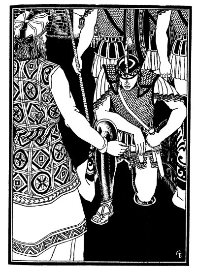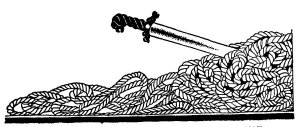 "Stand by while I try." And walking up quickly to the cart (he always did walk quickly), he began to work on one of the knots. Slowly and patiently he worked away. But still the knot remained unbroken. Then a sudden light flashed from his eyes. Snatching his sword he exclaimed: