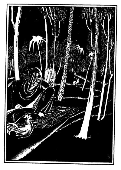 In the midst of the woods, he came upon an open space. There he halted his donkey and let the cock roost above him. He then spread a mat on the ground, lit a candle, opened one of his books and began to study.