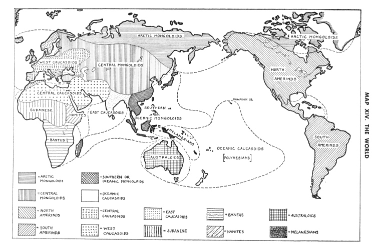 As currently defined the major branches of the human (Homo sapiens subsp.) species are distributed as illustrated on the world map on page 376 (Map XIV). They fall into four pretty clearly defined lumps; one with five major divisions; one with four subdivisions; and the others with two. Spotted about, but very sparsely, are also the remnants of two other basic and more primitive groups both now nearly extinct—namely, the Bushmen and the Pigmies. [Of course, there are also the recent wanderings of the western Caucasoids and Negroids but these I have ignored as not being in any way germane to our story.] From this map one may see more or less how the world was about the time of Columbus, and before the expansion of Europe had really gotten under way. Armed with this, one may then proceed to consider ABSMs in MLF, and in point of current fact. Both classes of data fall exactly into a single pattern.