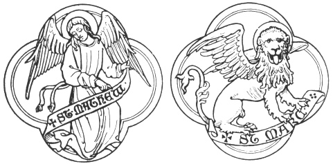 St. Mark: Winged Lion, The Resurrection.—The Lion was the symbol of St. Mark, who opens his gospel with the mission of John the Baptist, "the voice of one crying in the wilderness." He also sets forth the royal dignity of Christ and dwells upon His power manifested in the resurrection from the dead. The lion was accepted in early times as a symbol of