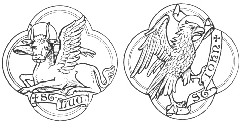 The winged living figures, symbols of the evangelists, which are most frequently met with, and which have ever been most in favour with Early Christian artists, appear to have been used at a very early date. They are taken from the vision of Ezekiel and the Revelation of St. John. "The writings of St. Jerome," says Audsley, "in the beginning of the fifth century gave to artists authority for the appropriation of the four creatures to the evangelists," and for reasons which are there given at length.